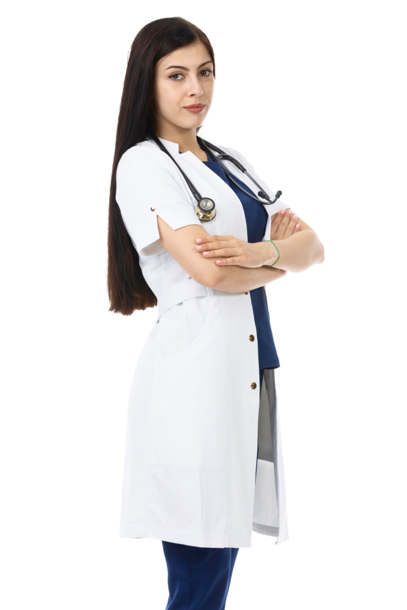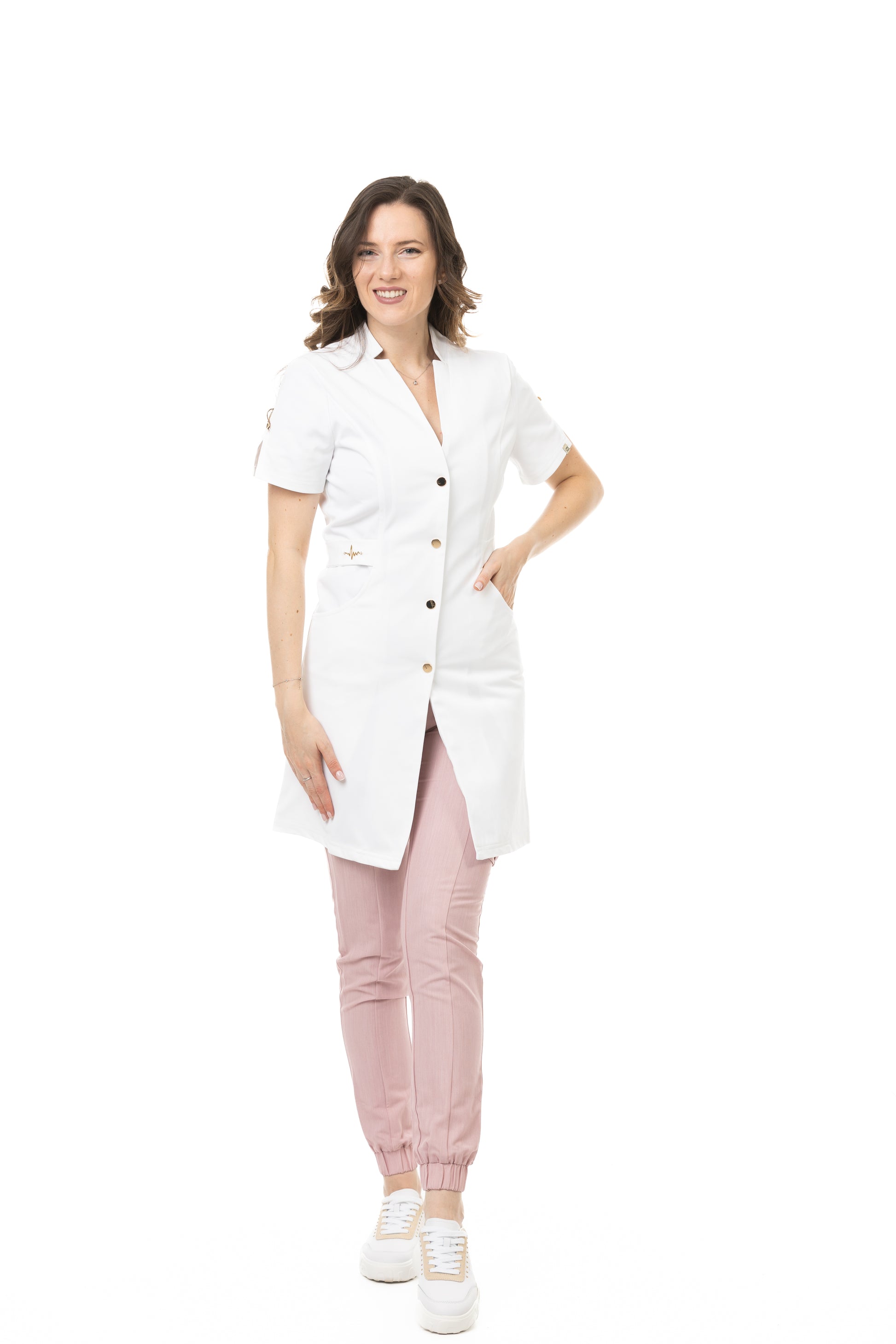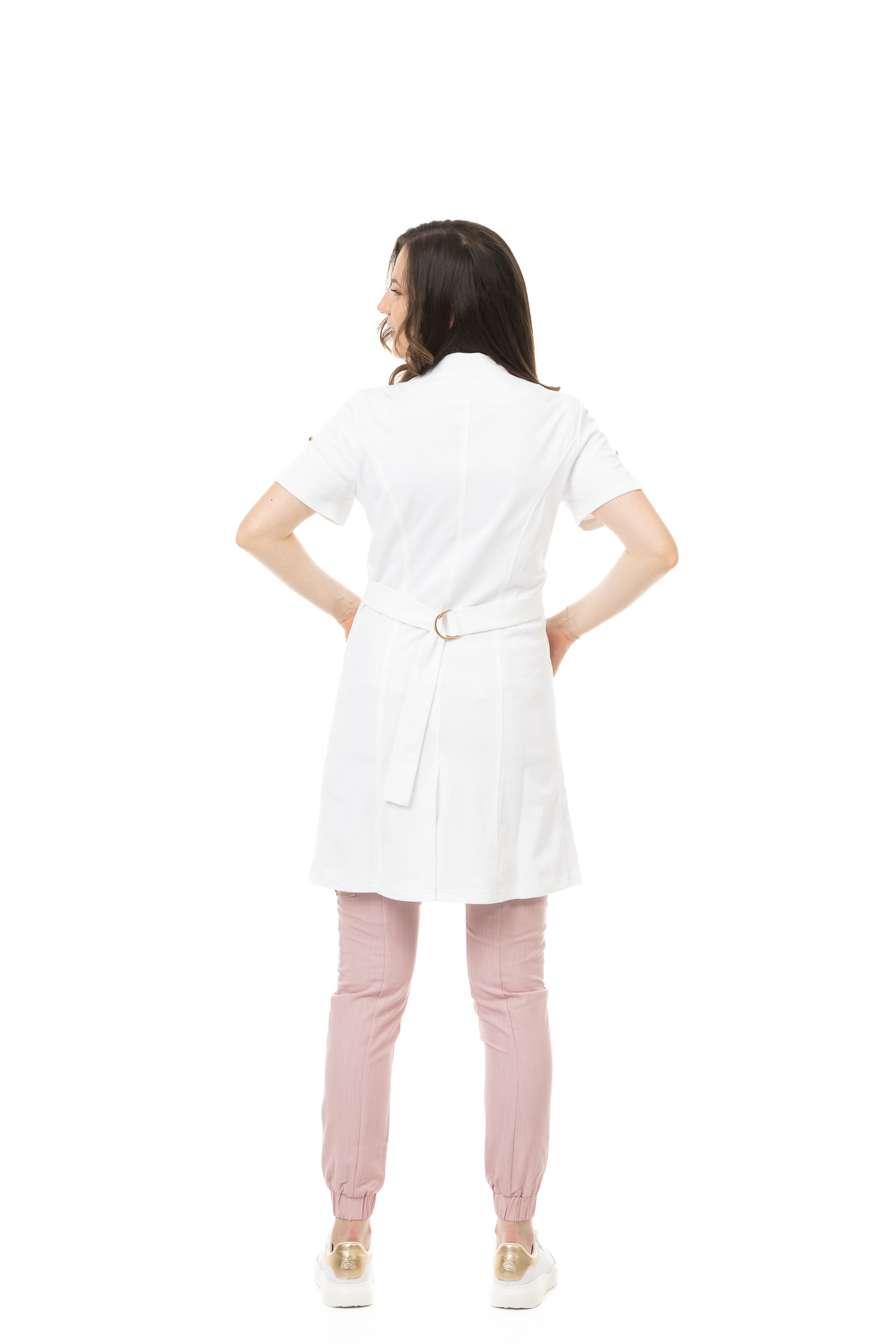 Елегантна и единствена по рода си медицинска престилка, която приковава всички погледи. Регулируемият затягащ колан със злетен детайл на гърба дава възможност за подчертаване на талията. Златистите тик-так метални копчета освен, че пеидават уникална и елегантна визия, позволяват бързо закопчаване и разкопчаване на мантата. На ръкавите ще намерите малък, но впечатляващ малък детайл под формата на сърце. Няма шанс да останете незабелязани с тази престилка! Дори пациентите ще Ви питат откъде е!