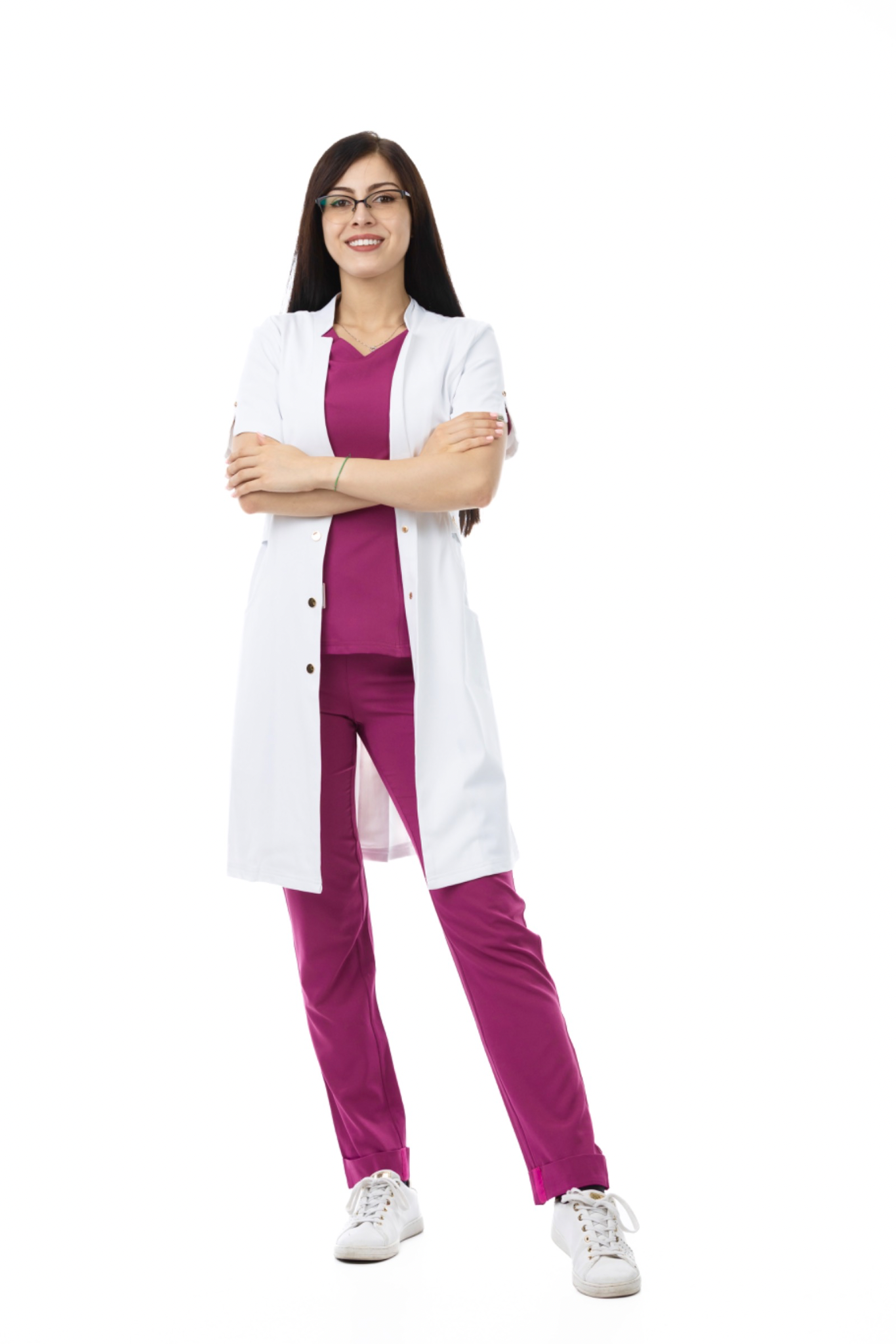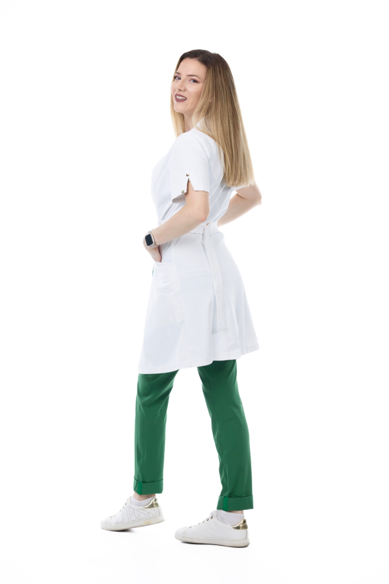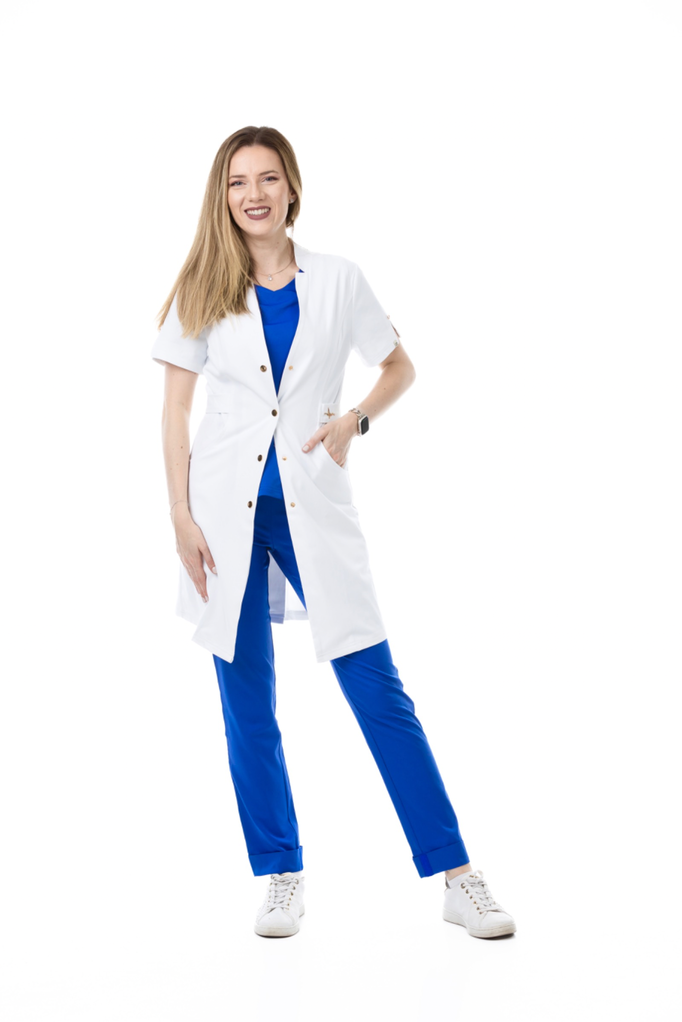 Елегантна и единствена по рода си медицинска престилка, която приковава всички погледи. Регулируемият затягащ колан със злетен детайл на гърба дава възможност за подчертаване на талията. Златистите тик-так метални копчета освен, че пеидават уникална и елегантна визия, позволяват бързо закопчаване и разкопчаване на мантата. На ръкавите ще намерите малък, но впечатляващ малък детайл под формата на сърце. Няма шанс да останете незабелязани с тази престилка! Дори пациентите ще Ви питат откъде е!
