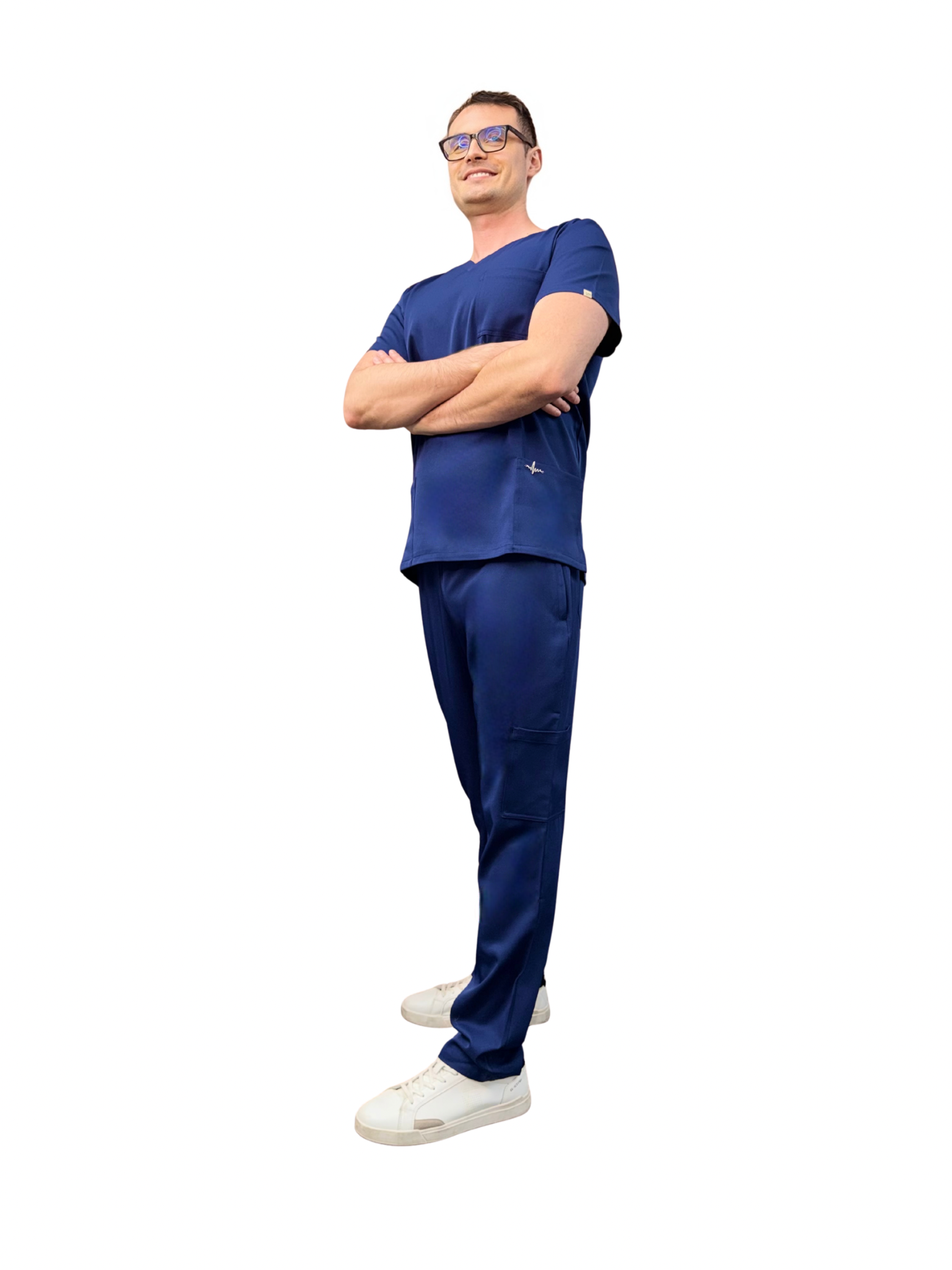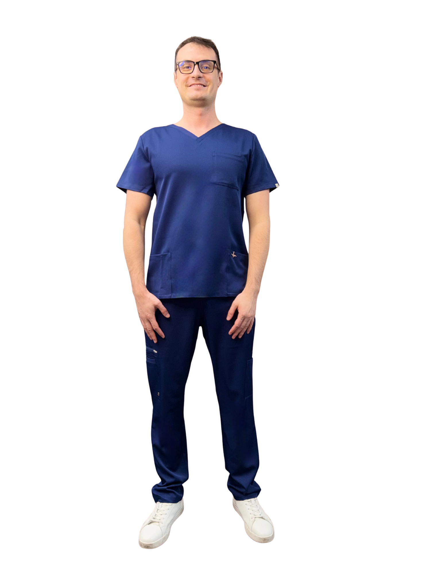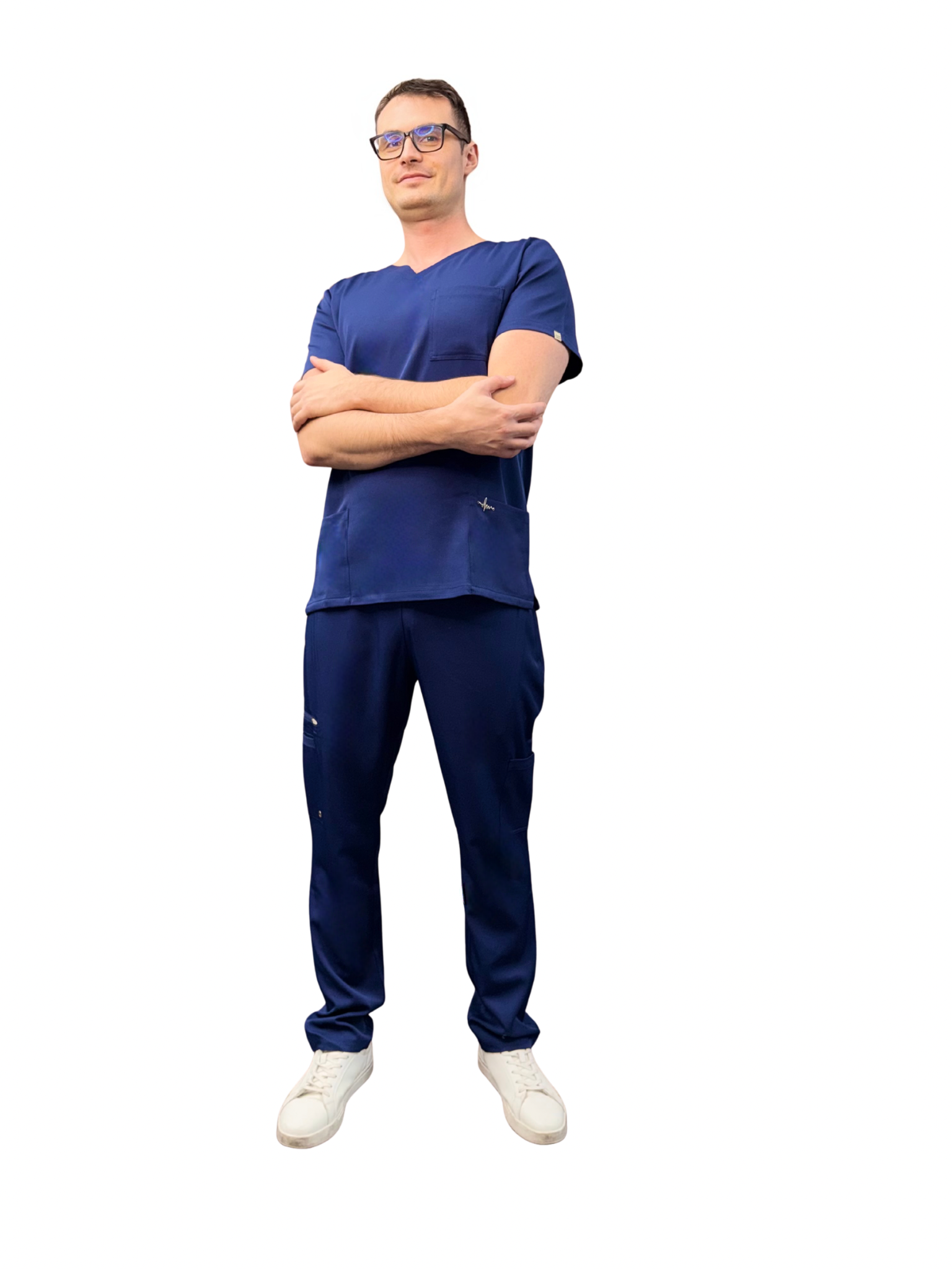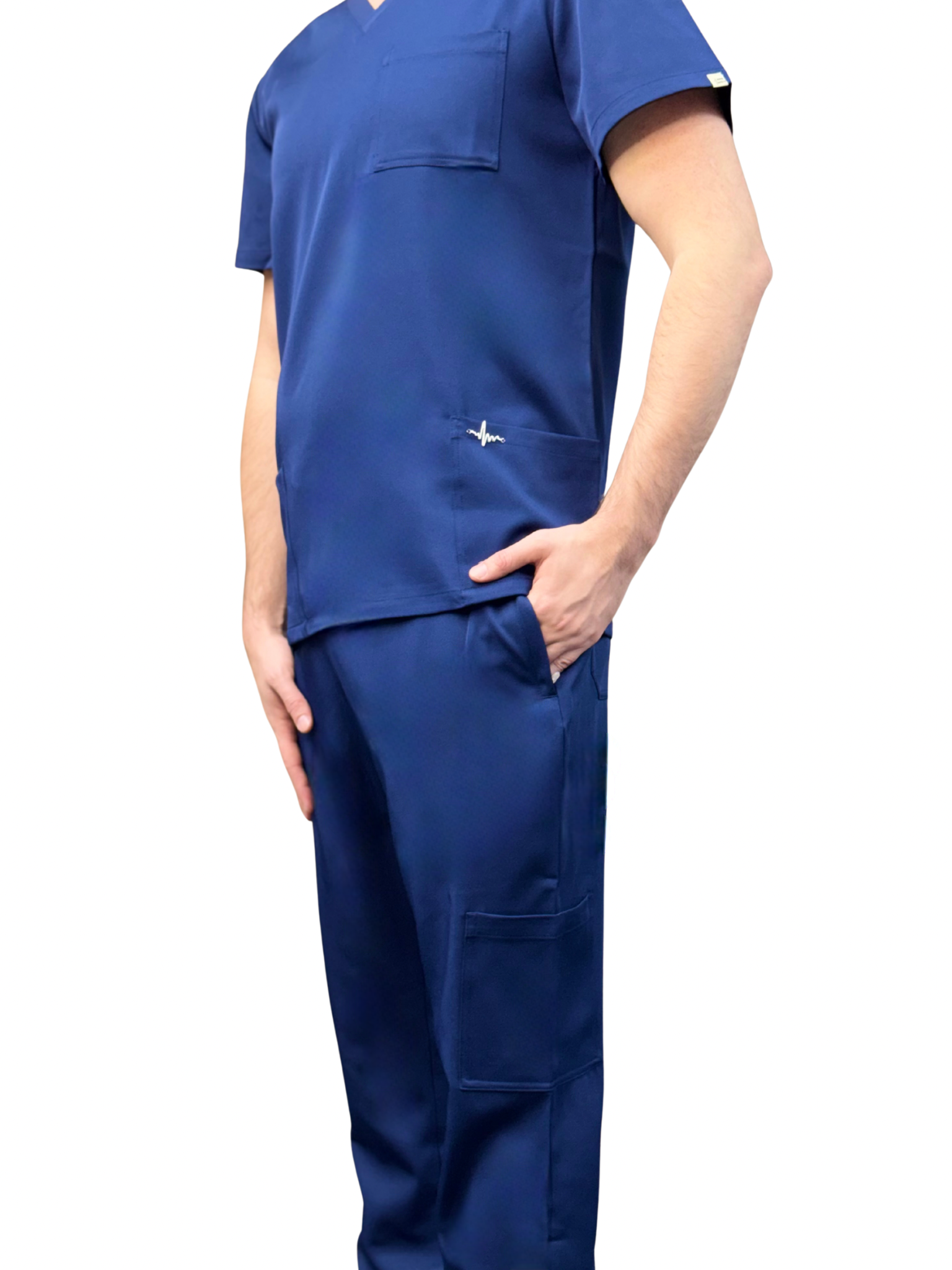Мъжкият медицински екип Male Blue съчетава комфорт, функционалност и модерен дизайн, за да осигури максимално удобство през целия работен ден. Изработен от висококачествена, дишаща и устойчива материя, този екип гарантира свобода на движение и запазва формата си дори при интензивно натоварване.