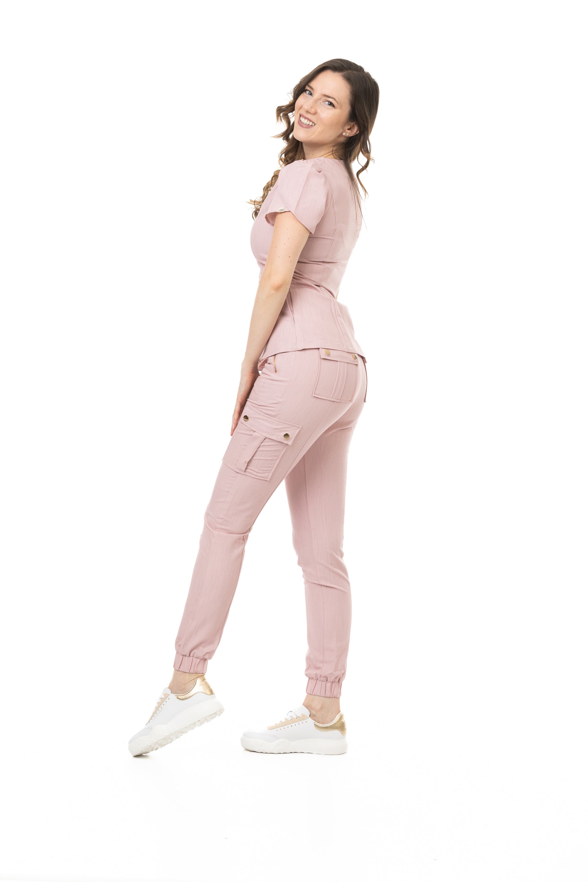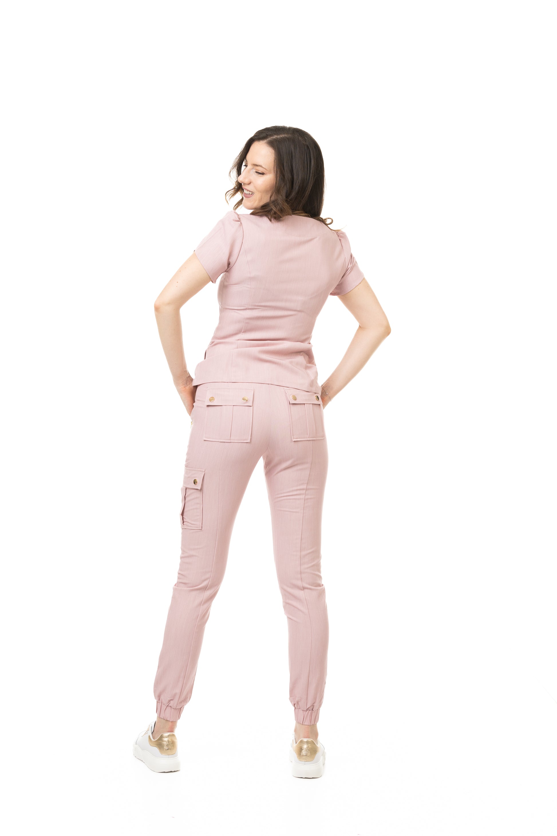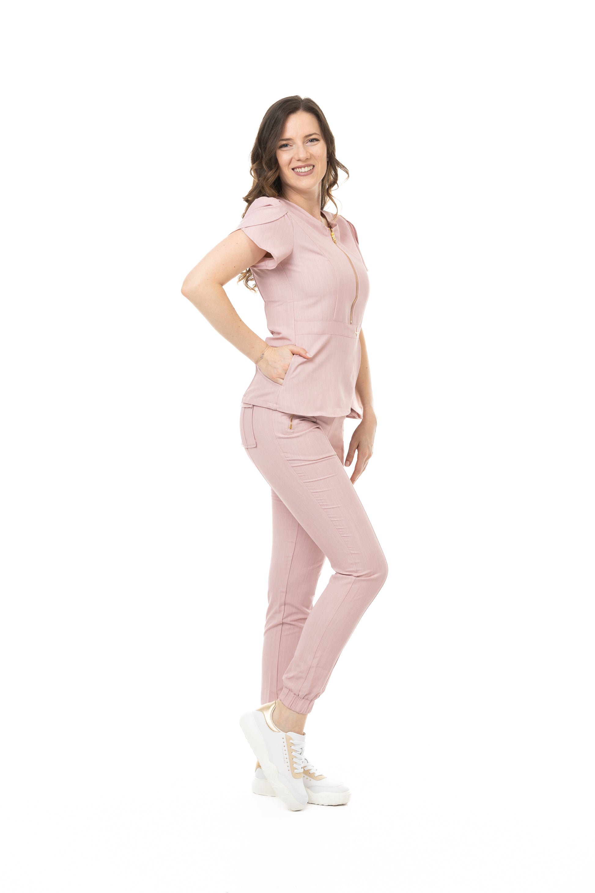 Пепел от рози, медицински екип за тези, които искат да съчетаят удобството с модерната визия! Застъпващият дизайн на туниката и ръкавите, както и вталеният панталон са само някои от предимствата! Платът е лек, подходящ е и за най-топлите дни, но същевременно е издръжлив на пране и достатъчно еластичен, за да осигури нужния комфорт. Разполага с множество джобове за необходимите вещи, а златистите детайли придават желания контраст за неотразимо работно присъствие!