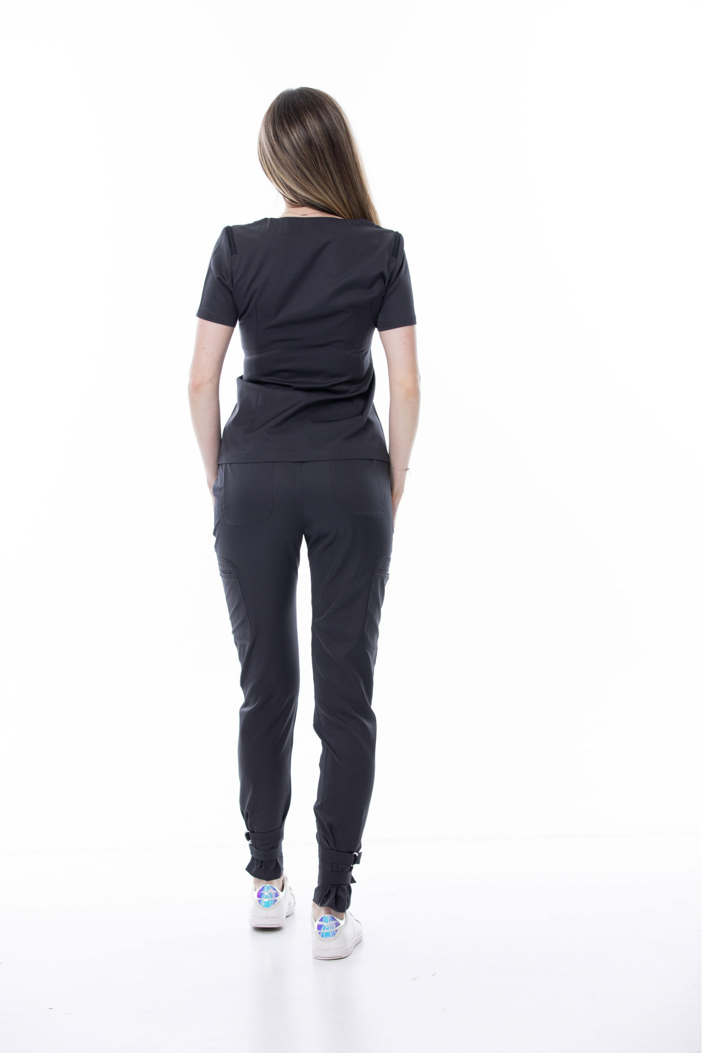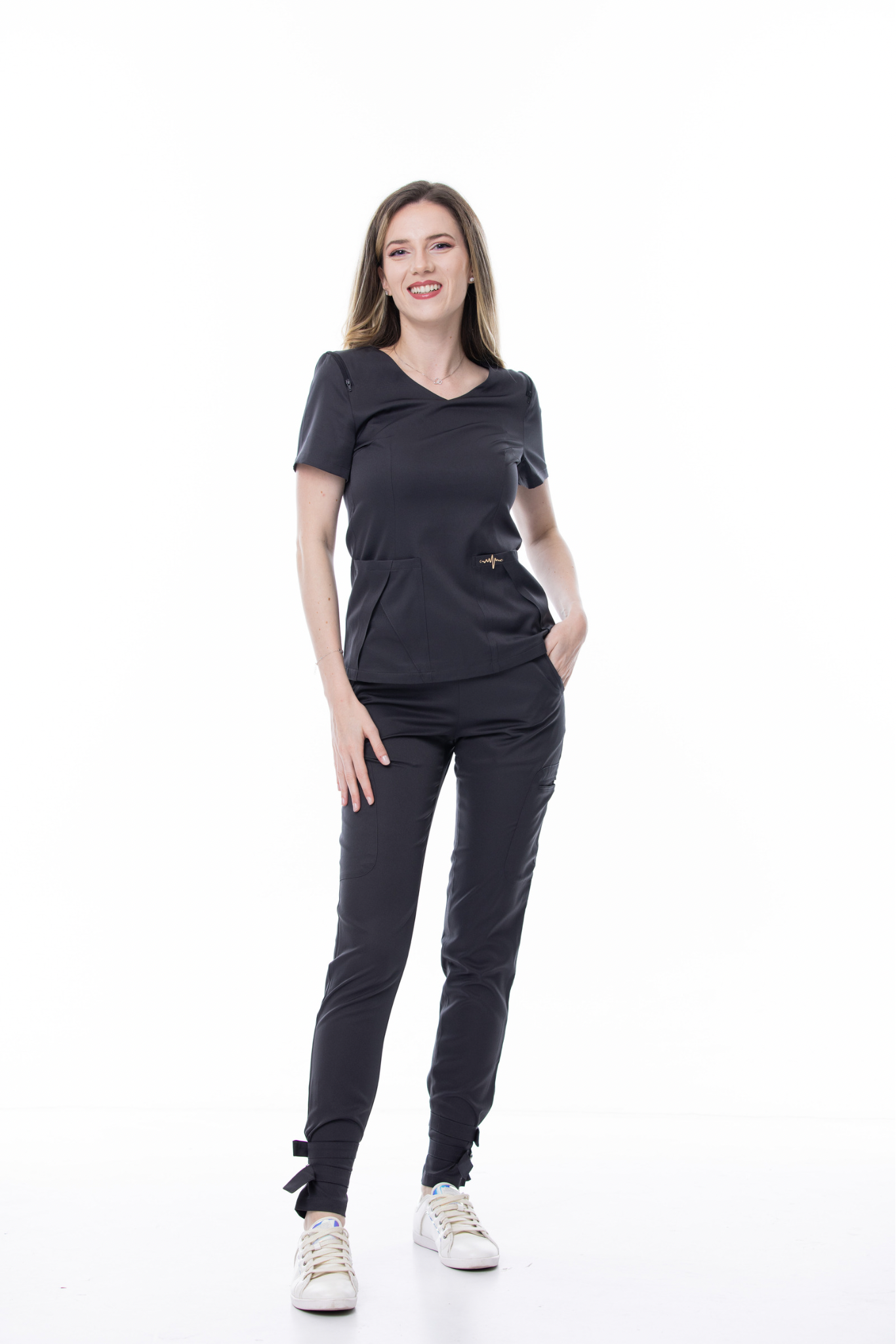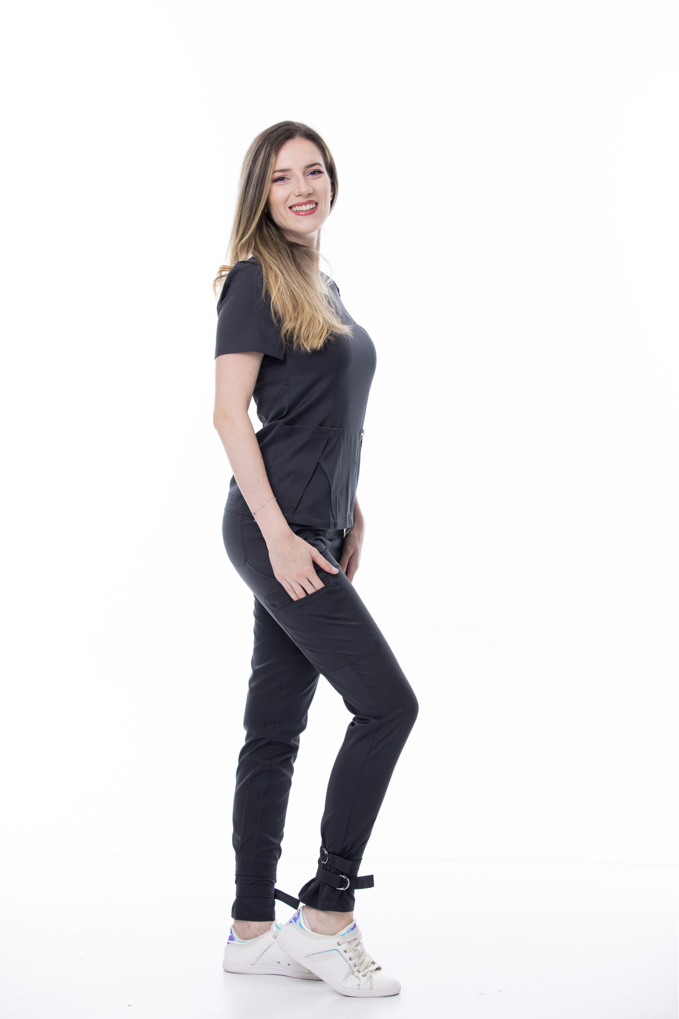 Графитът е цвят, който рядко се среща в медицинските среди. Точно заради това няма как да останете незабелязани с този дизайн. Супер еластичният и лек плат с нежен ненатраплив блясък ще направи визията Ви изключителна! Уникалното в този екип са и застъпващите джобове на туниката, както и връзките с метален детайл на глезена. Тази небрежна вталеност ще подчертае осанката и ще донесе истинско удоволствие за сетивата!